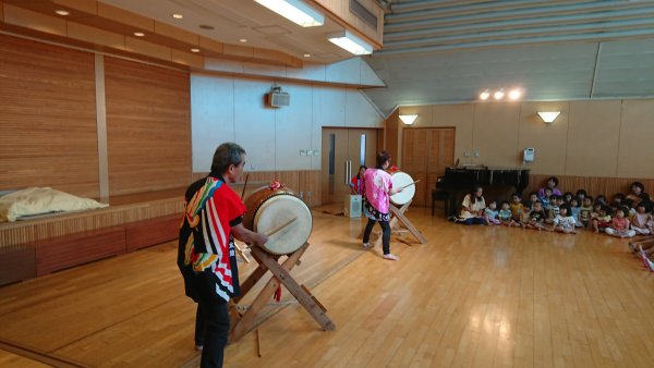 | 初めての園です、よその園でお世話になった先生からのお声がけで行ってきました 今日はリーダー不在自分がやるのかなって思ってたら マリが頑張ってくれました 久しぶりに太鼓の音に驚いて泣き出した子が2〜3人最後まで先生にしがみついて 泣いていました、ゴメンね! 演奏後アンコールもそれも”ドラえもん”って曲も指定で (笑)園児からお礼の 歌も聞かせてもらいました、太鼓体験も39人上手にたたいて くれました、なんと園児の給食を良かったらとマツキとマリが御馳走になっていました 又、呼んでくださいね。 |
