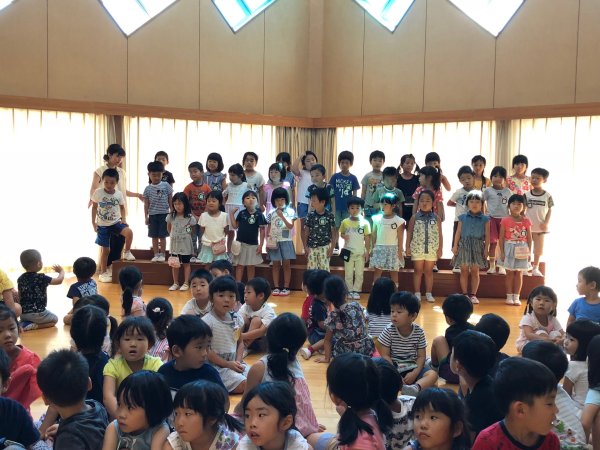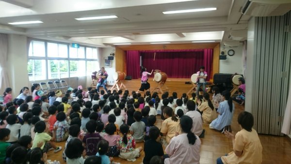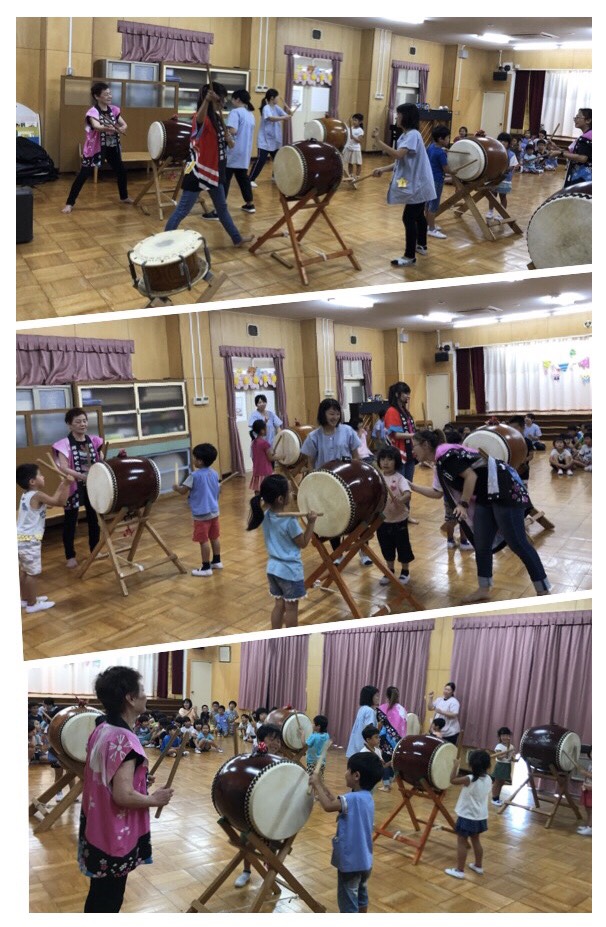 | 今年は強烈に暑い日が続いていますね、今日は4人で出かけました、お誕生日会の後 お楽しみ会での演奏です、今まではお誕生日の園児の親御さんにも見ていただいてい ますが今回は小さい組の親御さん?も一緒にって事で30人程の親御さんにも見てもらい ました、太鼓体験では58人の園児三歳児も参加でした(笑)何とか楽しんでもらいました。 |