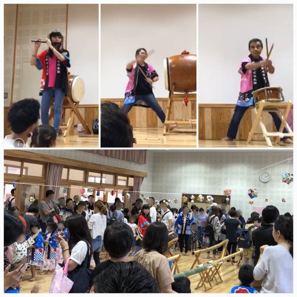 | 昨年に続き今年もさくら保育園の”夏祭り”に行ってきました、生憎の天気で室内遊戯室で園児の お遊戯と盆踊り、盆踊りではリーダーが飛び入りで縦打ちの盆太鼓を、やはり盆踊りには太鼓が あったほうが良いですよね、私達も団子とかいただいて楽しんできました。 |