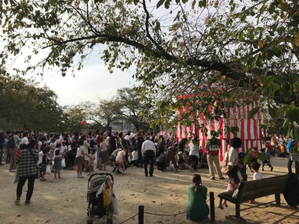 | 良い天気で気分よく演奏しています | 餅拾いの人が大勢見てくれています |