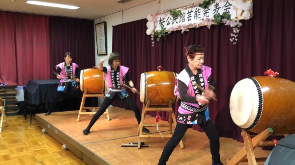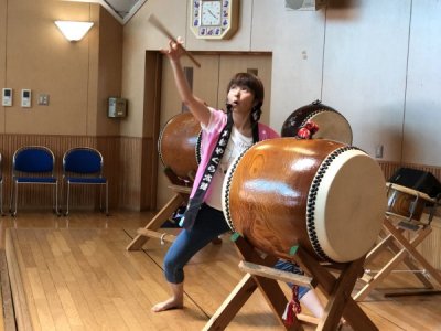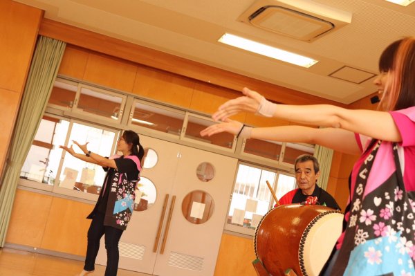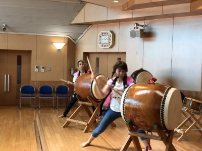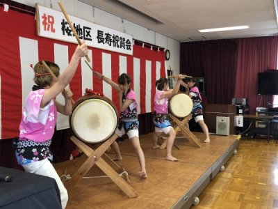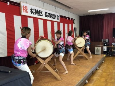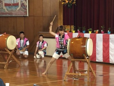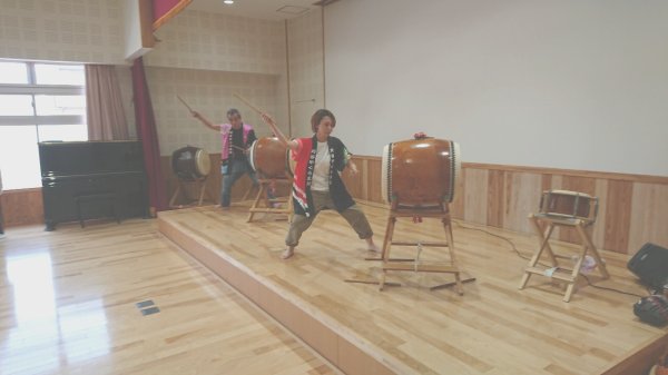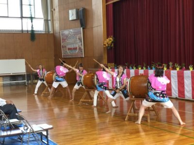 | こちらも毎年呼んでいただいている敬老会です、こちらは 広いですよ、小学校体育館での会です、ですから参加メンバー も7人太鼓の音も響いて気持よく演奏出来ます。 |