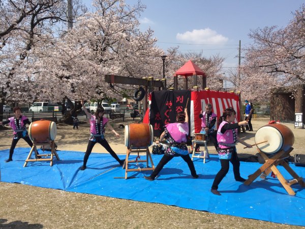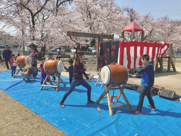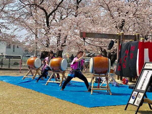 | リーダーミキの曲打ち 桜の巨木が分かりますね | 演奏後太鼓体験をしてもらいました、どこかで見た女性が 笑 |