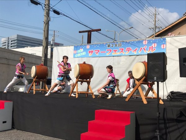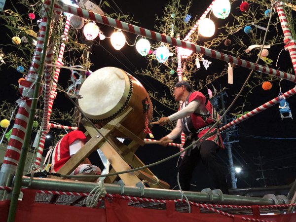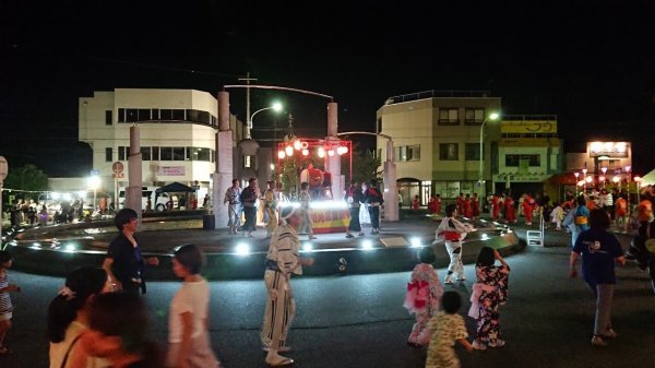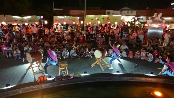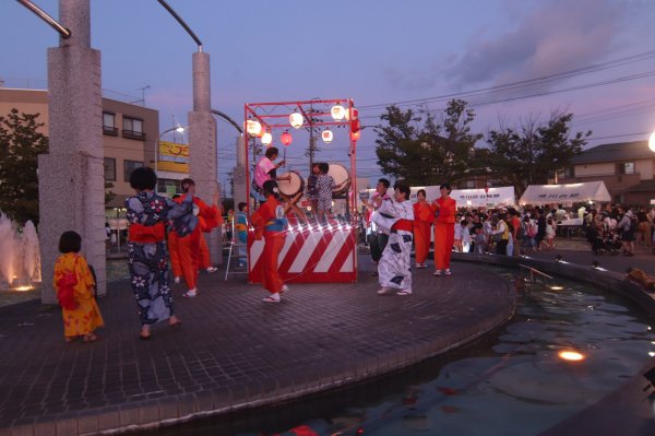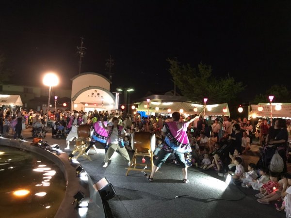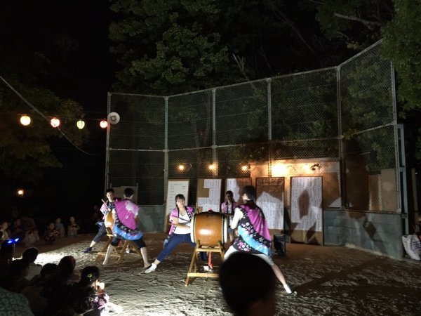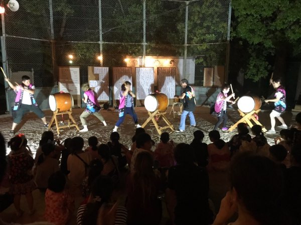 | 毎年呼んでいただいています、二晩連続の盆踊りです、一日は休憩時間に 太鼓の演奏もう一日はリーダーの大道芸(近年は都合でお休みしてます) 色々皆さんに楽しんでもらって、メンバーも入れ替わりで楽しんでいます。 太鼓・踊りの練習日もありますし盛大ですね、本番の太鼓は町内の子供が 叩きますメンバーは隣で子供のお手伝い (笑) |