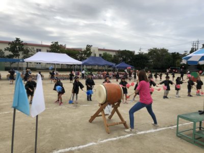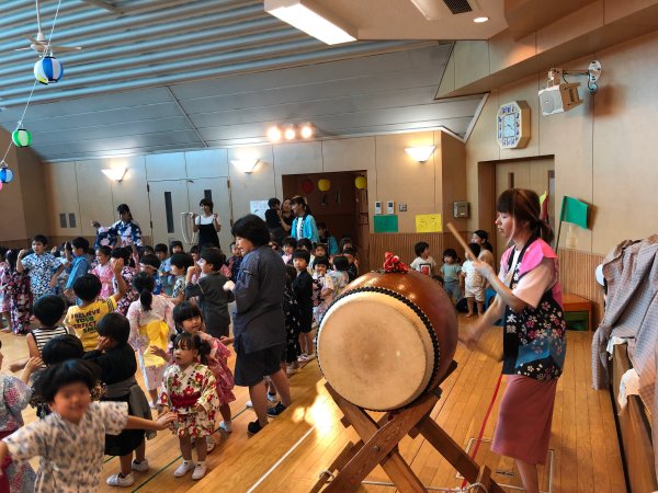 | 7日先ず園児の動きは全て太鼓で支持します (笑) | 音楽に合わせて太鼓と園児の踊り |