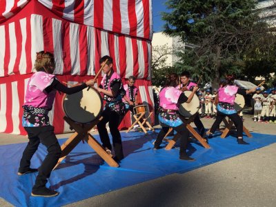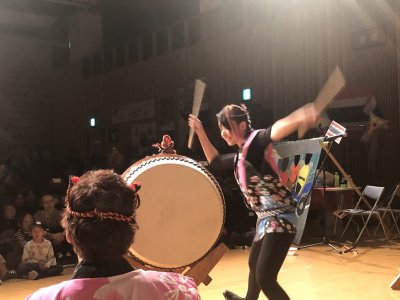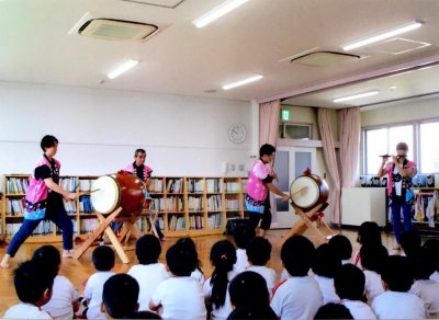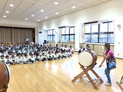 | 小垣江幼稚園に4人で行ってきました、お楽しみ会です、最近は パプリカが凄く受けますね、今日も園児達も踊ってくれました。 太鼓体験は少し少なく40人でした、最後には親御さんにも 体験してもらいました。 |