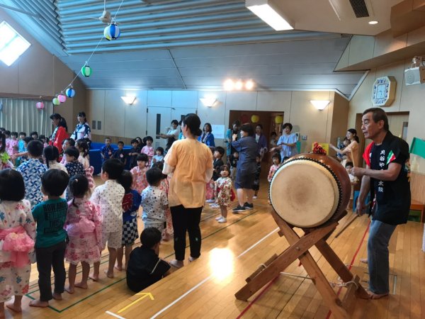 | 急遽保育園の”夏祭り”の盆踊りのお手伝いをお願いされてリーダーと出かけてきました 暑いから大変だろうなって、行ってみれば遊戯室で快適(笑)三曲だけでしたが楽しんで 来ました。 |