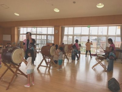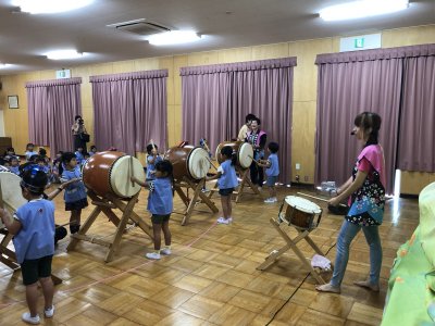 | またまた行ってきました、3人です今年は幼稚園保育園から沢山声をかけて 頂きました、さすがに今年最後かな?運動会のお手伝い夏祭りと13回かな ありがとうございます、子供達が一緒に歌ったり踊ったり 一生懸命太鼓を 叩いたり私達も本当に楽しくやらしていただいています、又声かけてくださいね。 |