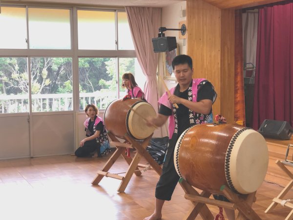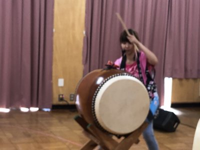 | 盆太鼓をたたく ミキ 園児が頑張って踊ってます | 久しぶりに盆太鼓をたたく 私 (笑) |