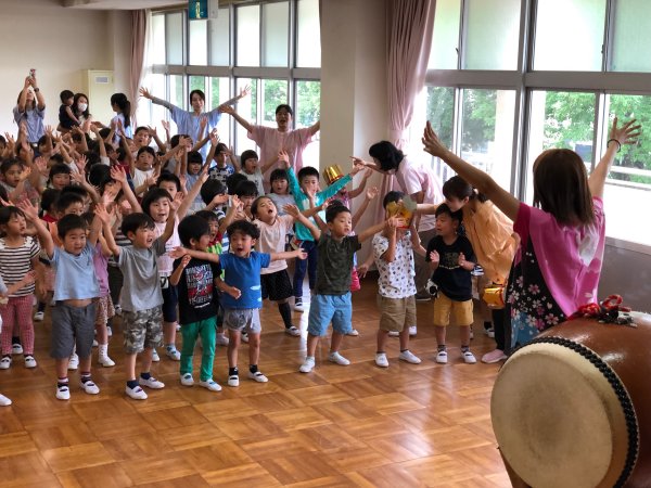 | アンコールで全員で踊ります パブリカ | 年長さん61人の太鼓体験が始まりました |