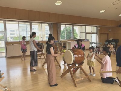 | 太鼓体験を頑張る 園児達指導マツキ | お母さん達も頑張って体験 |