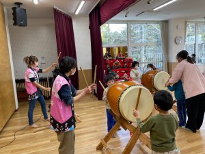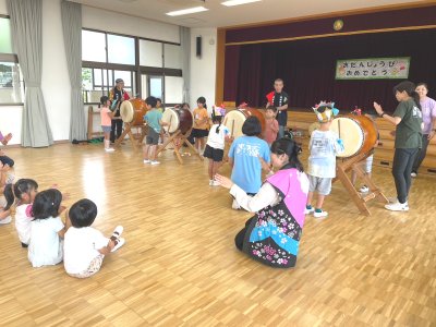 | 久しぶりなリーダーミキの演奏 | 今日誕生日のヒイナも頑張ってます | 5歳児の太鼓体験が始まりました |