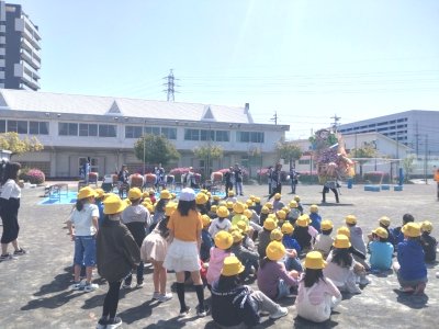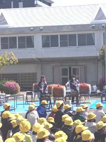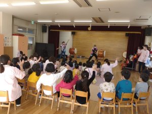 | 初めての幼児園です、移転新築された幼児園ですが以前良く 声をかけて頂いた衣浦幼稚園の園長先生がこちらに移動に なって、呼んでいただきました、今回は3回の演奏と年長さんの 太鼓体験です、園児も大きな声も出せるようになり楽しんで もらえたようです。 |