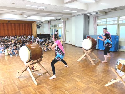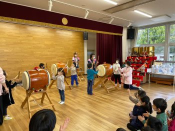| 衣浦幼稚園の誕生日会のお楽しみに行ってきました コロナも少し落ち着いて?園児全員の前で一回の演奏 でした(笑)演奏終了後年長さん46人のお楽しみ太鼓体験 やっとマスクも取れて大きな声も出て皆元気に楽しんで くれたようです、又声をかけてくださいね!! |