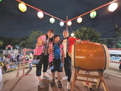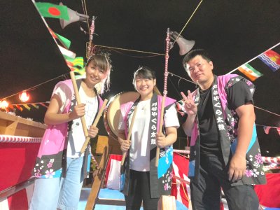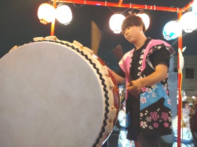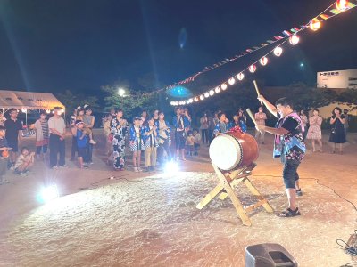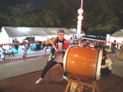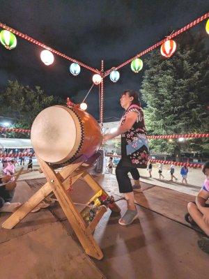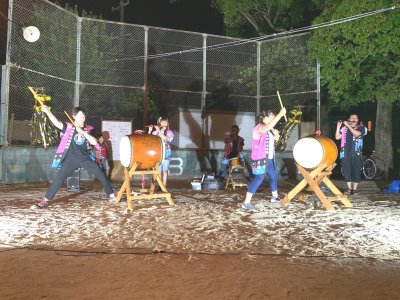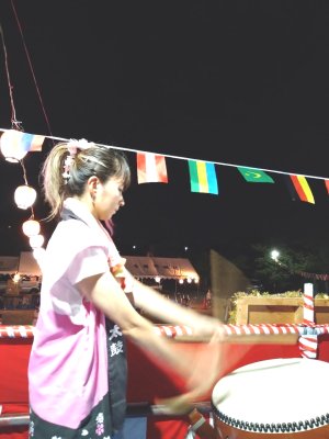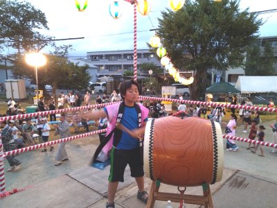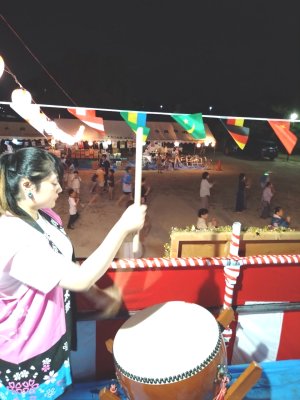 | 毎年恒例の高津波の盆踊りに今年も呼んでいただきました 5日は6人6日は5人?やぐらでは高津波の尺7?の大きな 太鼓チョツト低めの良い音の太鼓をメンバーが頑張って たたき、休憩時間にはやぐら太鼓の演奏を大勢のお客さんの 前で気持よく演奏できました 6日にわか雨にあって 最後の一曲は出来ませんでしたが、皆さん楽しんでいただけた 様でした、9月には敬老会にも呼んでいただいています。 |