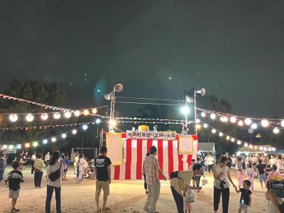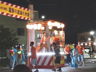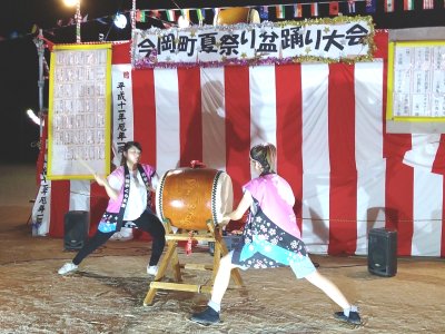 | 今岡地区の盆踊りは初めてです、7月29.30日には今川地区と 合同で小学校の体育館で踊り、太鼓の練習がありやぐらも お手伝いに行きました、12日には子供太鼓のお手伝いを 13日には休憩時間にやぐら太鼓の演奏披露をしてきました |