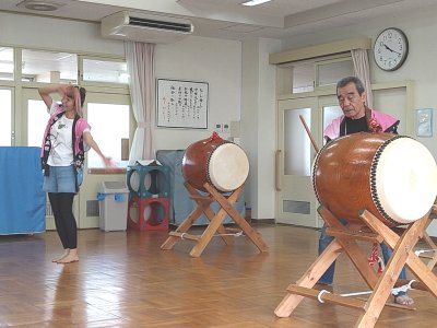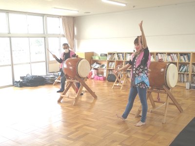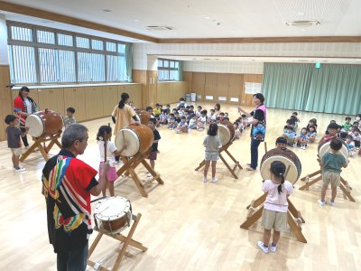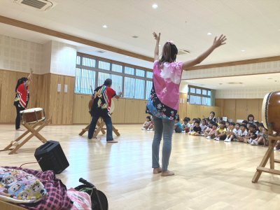 | 年長さんの太鼓体験 | 神谷さんしんちゃん音頭、踊り ミキ・ラン |
