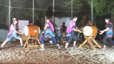 | リーダーミキのソロ打ち | カエ・ミキの担ぎ桶太鼓 |