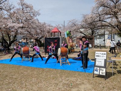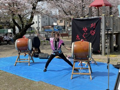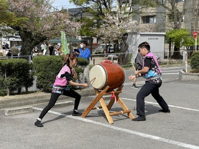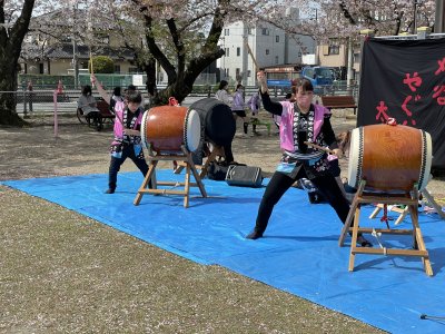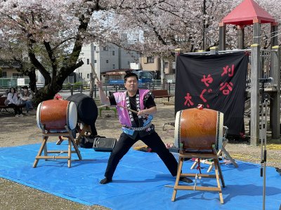 | 素晴らしい天気の中3年振り?に満開の桜の下地元の フェスティバルに参加してきました、今回の目玉は けい君の初のステージでしたが、何とか相棒ユリちゃん との息もピッタリ演奏が出来ました、時折吹く風で 花吹雪ありで、良い感じの演奏が出来ました、天気が 良すぎて暑かったなんて贅沢な文句が出るほどの フェイスタで楽しんできました!! 演奏後の太鼓体験には大勢の人が参加してくれて 参加賞のお菓子が足りなくなる程でした(笑)