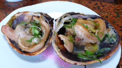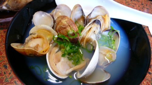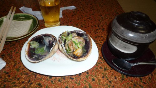 日間賀島では一潮に1〜2日しかアサリを採る事が出来ません、観光客用には1400円でとる量も制限されるようですが中平さんでは500円?で制限も無いようです? 大きなアサリの酒蒸しです最高に美味しい! |