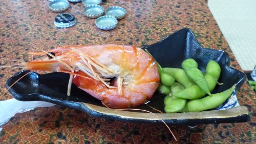 大きな車えびのボイルと枝豆です、メンバーの注文で枝豆と蛸せんべいを頼みましたが・・・女将さん何時もにようにサービスで勘定とらない、有難う御座います。