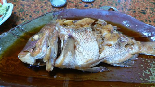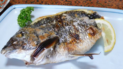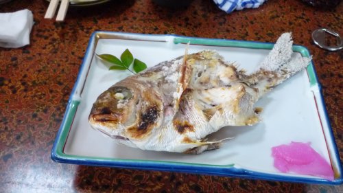 鯛の塩焼きです、他に写真を載せませんでしたが 蛸飯・茹で蛸・車えびのオドリ(私は何時ものように軽く焼いてもらいました)漬物・御飯・・・???