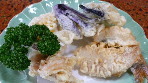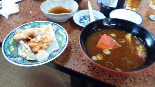 河豚・ナス・ウタセエビ(アカシャエビ)の掻揚げの天婦羅と渡り蟹の赤だしです。良い出汁で美味しい赤出汁はいただきましたが 天婦羅はお持ち帰り!
