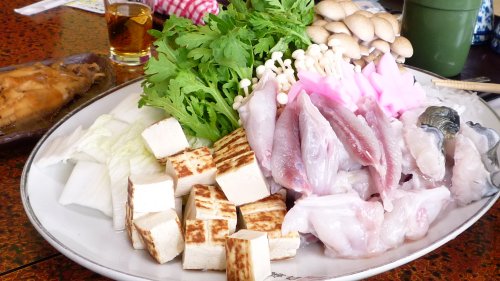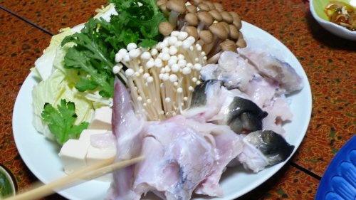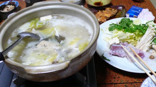此処に載せた写真以外には モズク・茹で蛸・蛸飯・河豚カラ揚げ・日蛸を酒で戻した物・なんこう梅・テッチリの関東式雑炊・・・。 今日も沢山出してもらえました。 ←テッチリの材料。 |