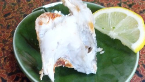 何時も焼いてもらう”河豚のカマ”の塩焼きです、是も美味しくて大好きです。 ピントが?? |