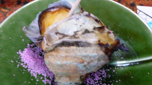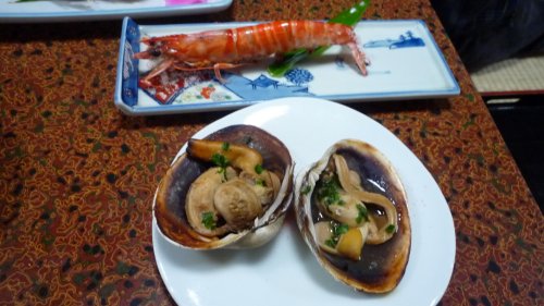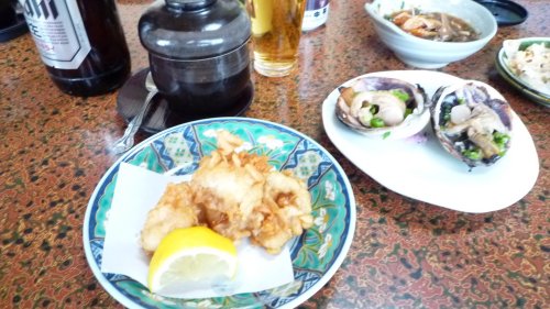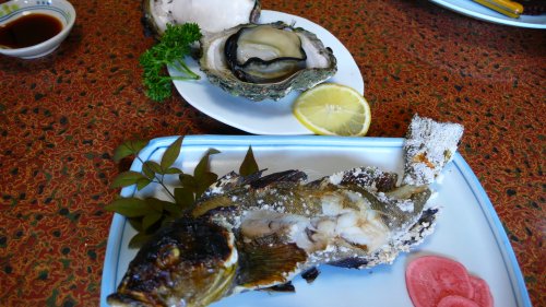 焼き魚は”アイナメ” 向こうには”岩かき”今日の魚・貝大きなものばかりで凄いボリューム食べきれずに焼き魚と蛸はお持ち帰りしました。
