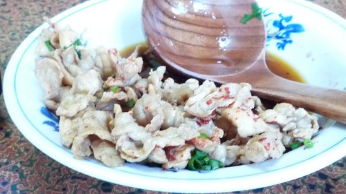 何時も別皿で出してくれる私の大好きな”テッピ”です。 向こうの大皿は”トオトウミ”生で”シャブシャブ”でいただきます。 是が又トロトロで大好きです。 |