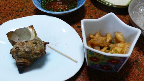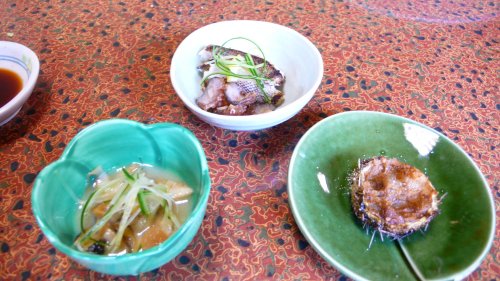 左はミガキボラ貝の味噌和え、向こうはアイナメのタタキと湯引きした海鼠、右は白うに、ミガキボラ貝は表面がつるつるとした綺麗な巻貝です、白うには大きくなるとムラサキうにになるそうです。