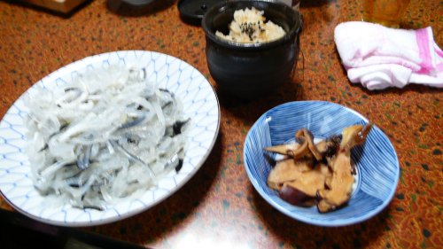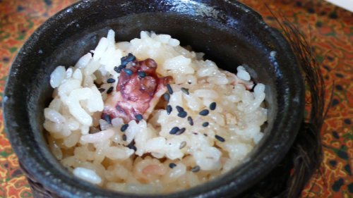 締めは”蛸飯”です、中平さんの蛸飯は絶品です ツァー客も頼んでパックでお持ち帰りのようでした。 私も食べれずに持ち帰りました。 |