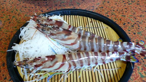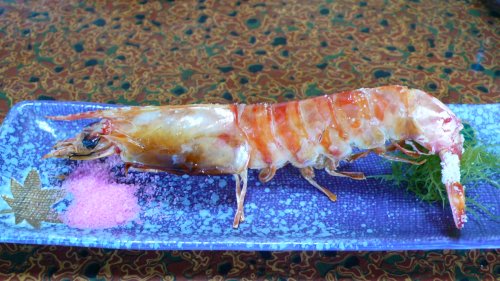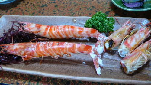 綺麗な”車えび”でしょう、海草とか水分のある物?に寝かせると大人しくしてるようです?何時ものように”塩焼き”にしてもらいました。