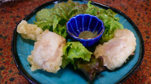 初めて戴きました”トラフグの白子の天婦羅”塩で戴きましたが”絶品 トロトロ。 河豚は3月で終わってるんですが漁の網に入った物はしょうがないって事だそうです。 (゜゜)(。。)(゜゜)(。。)うんうん(^0^)/きゃはは |
