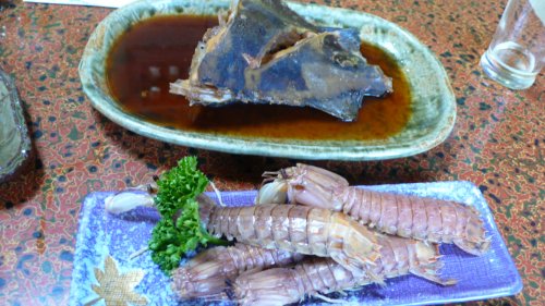 手前はまだ小振りですが”シャコ”瑞々しく甘い。 向こうは”アイゴ”此処のアイゴは大きくて毒のヒレを切って半分に切ってもこの大きさです。 |