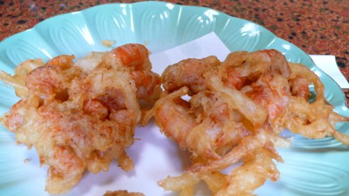 少し大きめの”ウタセエビ(アカシャエビ)”の頭と尾をとった掻揚げです、エビがプリプリで美味しい、揚物大好きなかみさんが喜んでいました。