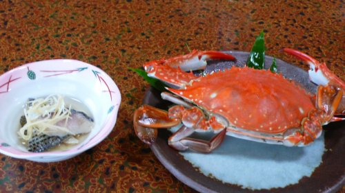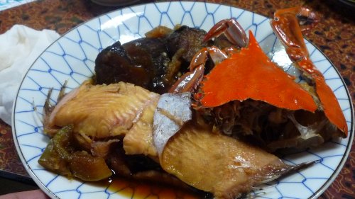 女将さんが田舎料理を作って見ましたって、カレイ・渡蟹・ナス・白ナス・しいたけ等を煮つけてくれました! 是も美味しいんですがここまで来るともう苦しい! でもいただきます。 |