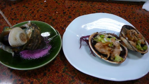 チョツト写真が暗いですね! 左は”さざえ”丁度良い大きさでプリプリの身が最高です、日間賀のサザエは肝も苦くありません、右は”大アサリ”これも砂なんかかんでた事ありません。 |