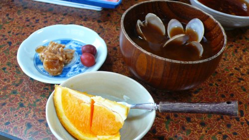 島アサリの赤だし・守口漬け・小梅 フルーツ もう目いっぱい腹に詰め込んで入りませんが 島あさりの赤だしはいただきます。