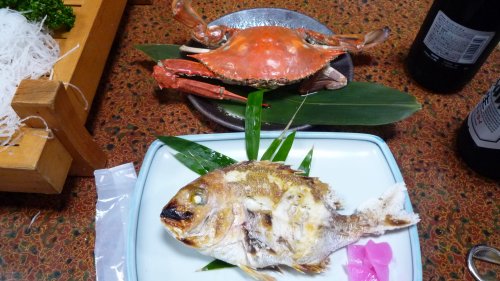 こちらでは先日3,000円してたそうです”渡蟹”女将さんは心配してましたがしっかりみそも実も入っていました。 焼き魚は”真鯛”お持ち帰りです。 |