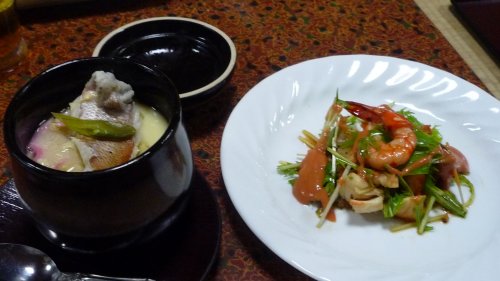 大きな真鯛の切り身が入った茶碗蒸し。 海鮮サラダ?伊勢海老と車えびとミズナを女将さん特製のドレッシングでアエマシタ。 サッパリして美味しかった! |