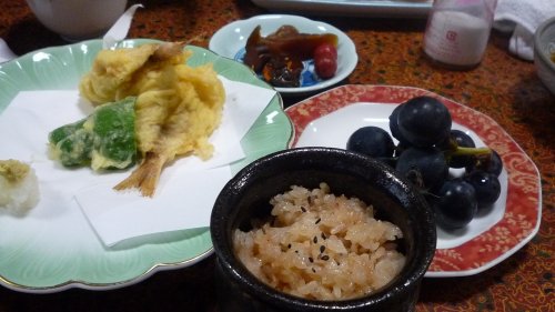 天婦羅・蛸飯・ぶどう・漬物。 もう私はお腹いっぱいで食べられませんが、何時もは半分以上持って帰る森岡さんが渡蟹以外全て完食!凄い! |