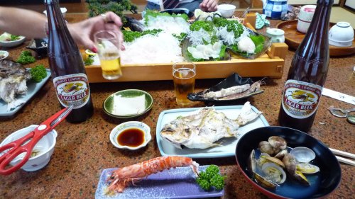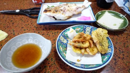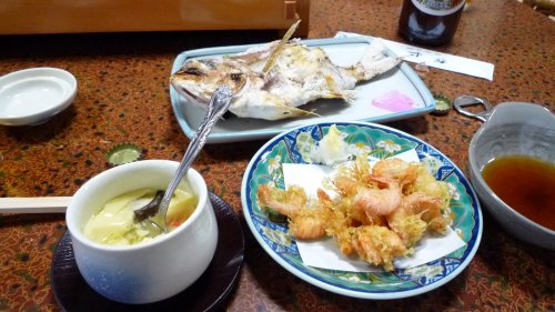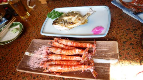 大き目の真鯛の塩焼き、アカシャエビの掻揚げ(掻揚げって言ってもほとんどエビばかりですが(^0^)/きゃはは)、他には、島あさり酒蒸し、車えび(私と伊予ちゃんは塩焼き、中村さんはオドリ)茶碗蒸し、蛸飯、茹で蛸、もずく、渡り蟹赤だし、香の物、デザート
