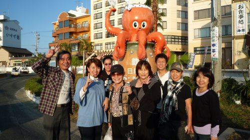 帰りには、お馴染み”あっぱれ蛸”の前で 集合写真! 帰りに撮ると丁度良いんですが今日は天気が良くて西日が強く目が痛いぐらいでした。 |