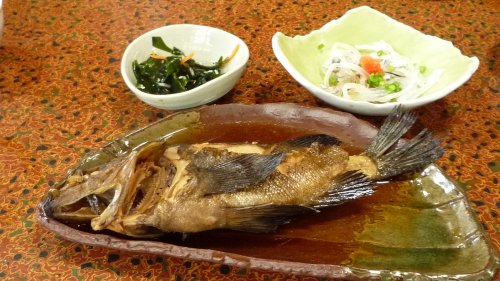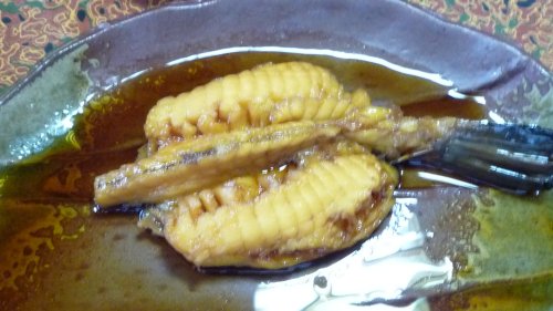 ギバフグの煮つけ、身離れが良く食べやすく美味しい、私は始めていただきましたが、聞けばこの時期トラフグの代用で良く使われるそうです、普通の魚とカワハギの中間ぐらいの歯ごたえかな?