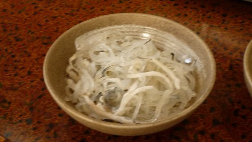 メカブのようですが? 女将さん手作りのワカメの茎をさっと湯がいて刻み叩いてヌメリを出して味付けした出し汁に花かつをを振った物です、メカブより歯ごたえがあって美味しかった、一緒した一人が御飯をもらって掛けていただいていました。