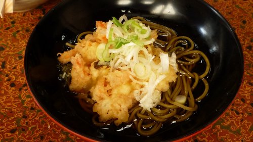 凄くこしのある”茶そば”に”ウタセエビ(アカシャエビ)”のかき揚げをのせて出してくれました、もう満腹ですがまだまだ食べますよ!