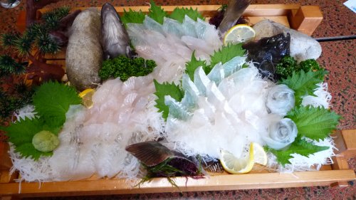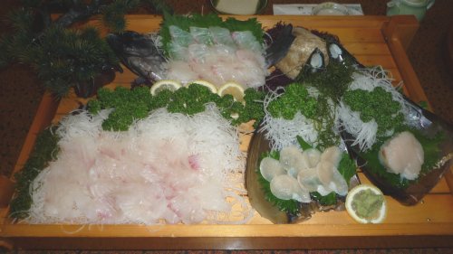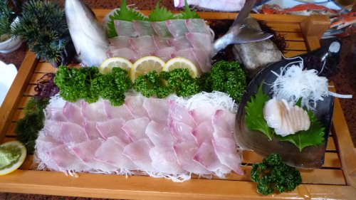 今回は9名の参加です、何時も月曜日でメンバーには迷惑を掛けていますが、有給を取って参加してくれています。 ←ヒラメのお造り! 上の黒鯛と半々に盛り付けてくれています。 |