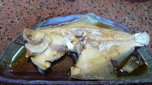 大きなカレイの煮魚です、活きですから身がはじけています、大きいから結構あぶらものっていました。これぐらい薄味にしてくれると魚の良さが出ますね。
