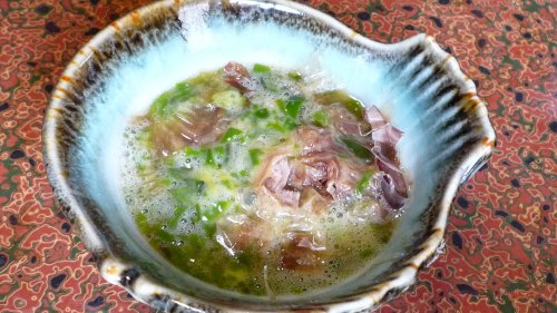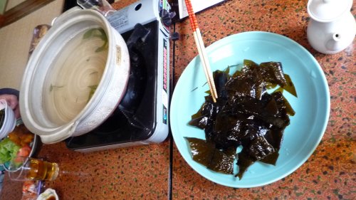 ワカメのシャブシャブです。 ポンズでいただきますが、湯に入れた時にさっと真っ青に色が変わるのと歯ごたえがたまりません、私はワカメはこの方法でいただくのが一番好きです。 |